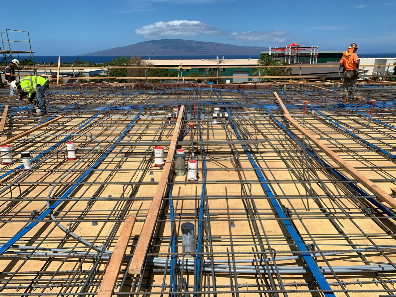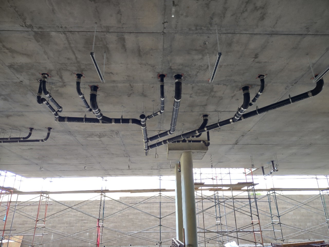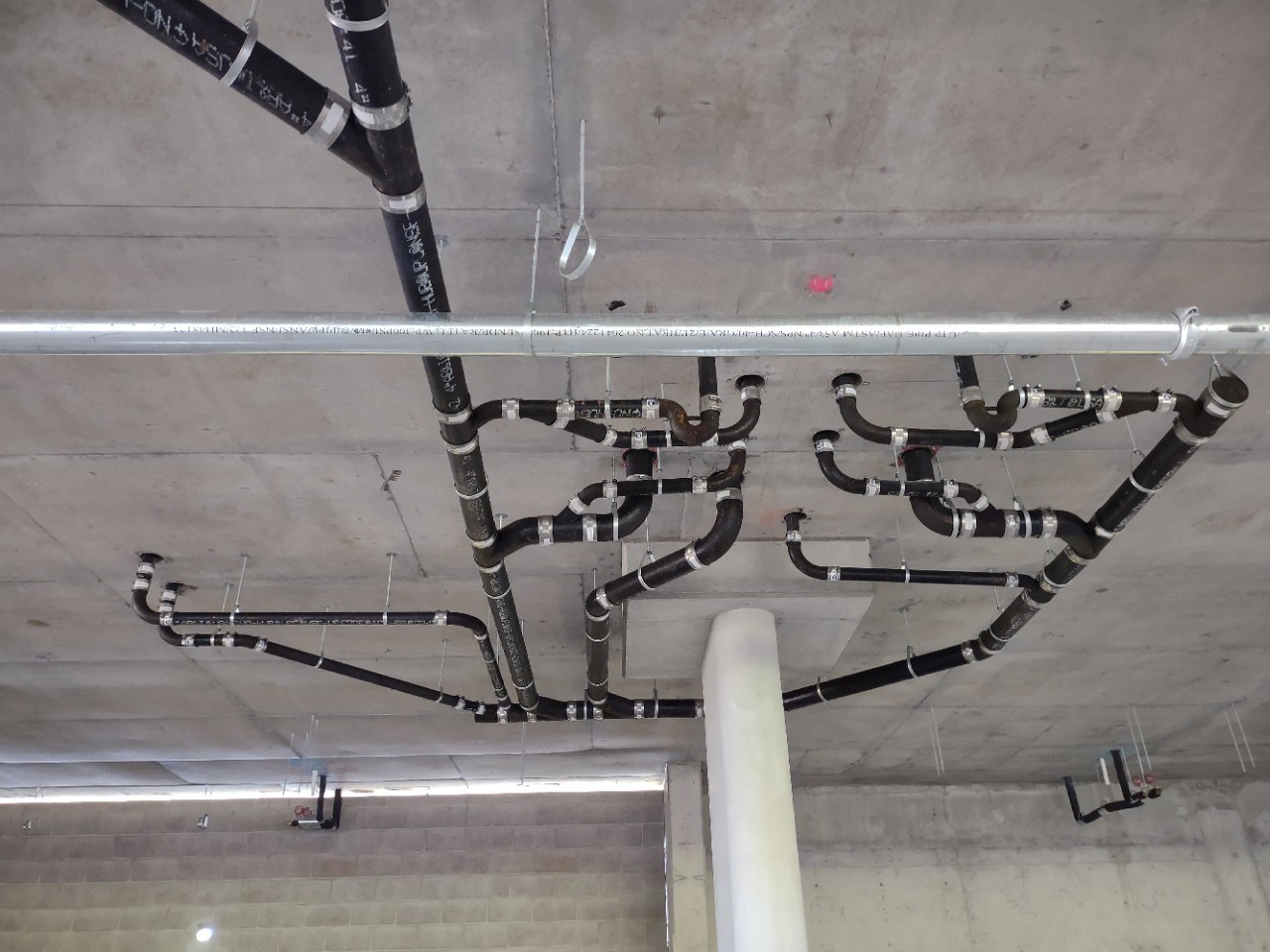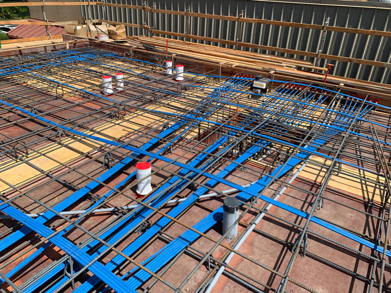The work under the podium also required thorough coordination with the structural components of the suspended slab such as rebar and post-tension cables. Using a total robotic station, we were able to quickly and accurately place over 400 Hold-Rite firestopping sleeves for piping penetrations and 800 pre-cast anchors for pipe hangers.