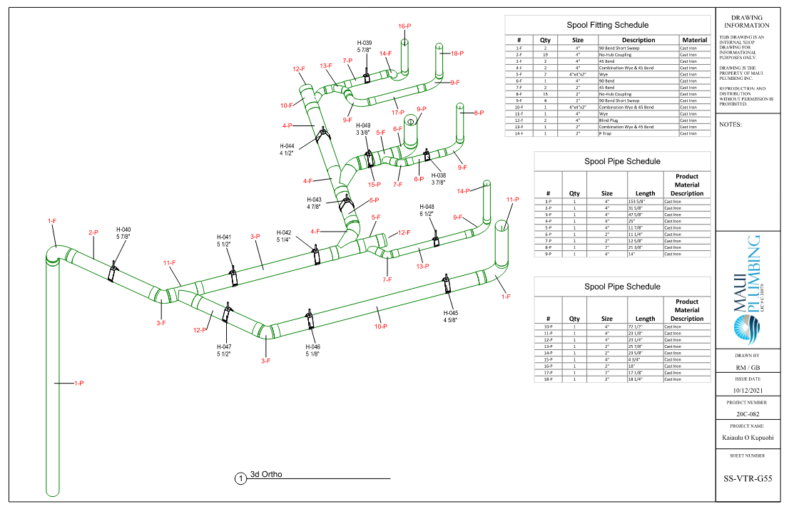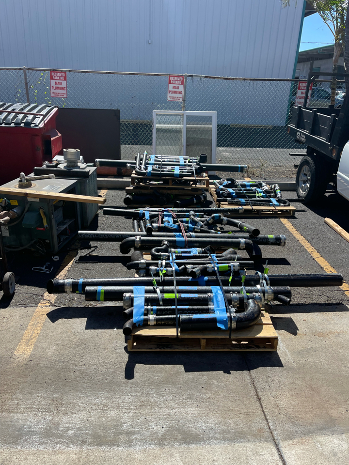 The DWV and copper water piping systems were pre-fabricated off-site. The fab shop cut hanger rods and piping for the Cast Iron DWV & copper water piping to length utilizing a Tigerstop saw system. The components were packaged and palletized by building area and distributed to the site. Each package contained the necessary fittings, pipe and hangers, and spool sheet for assembly onsite. Prefabricating components off-site allowed for smoother and faster, and safer installation onsite.