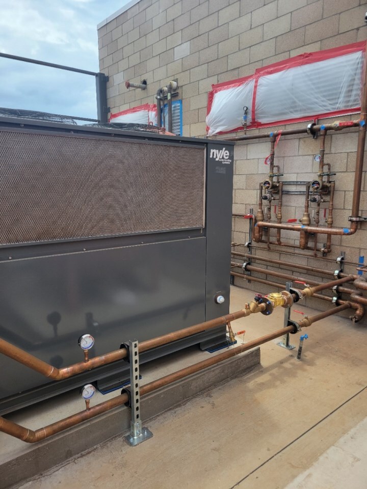The athletics building was plumbed with a total of 53 showers for the boys’ and girls’ locker rooms. The high hot water demand was met with a 2750-gallon hot water heating plant powered by two Nyle C250 heat pump water heaters.
