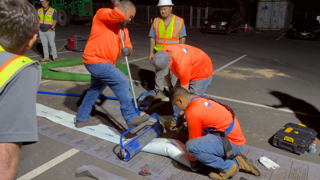 With the downstream manhole located in the middle of a major roadway, a traditional bypass setup would have required significant traffic disruption. Instead, our team developed an alternative upstream bypass strategy, routing over 700 feet to a secondary connection point off Mahalani Street. The system was supported with redundant pumping capacity and backup measures to ensure continuous operation.